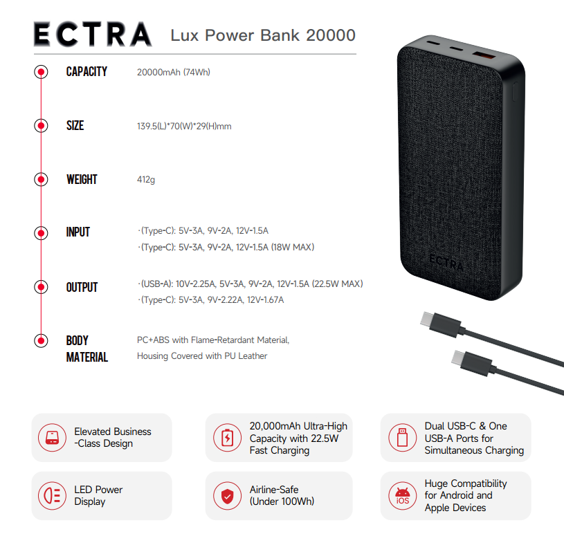 - 20,000mAh Ultra-High Capacity with 22.5W Fast Charging