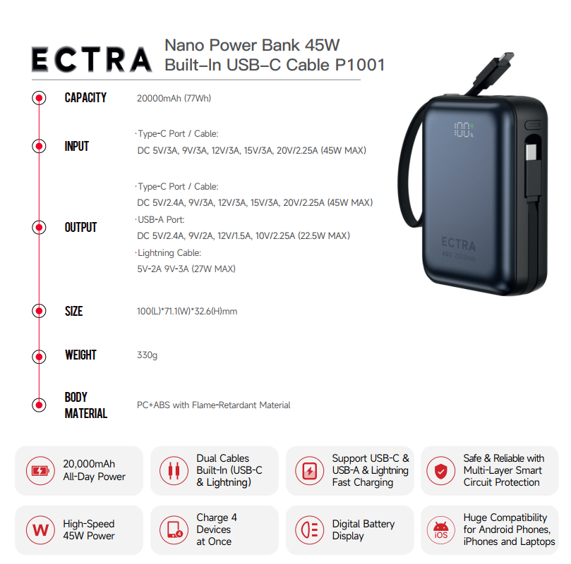 ECTRA Nano Power Bank 45W Built-In USB-C Cable P1001