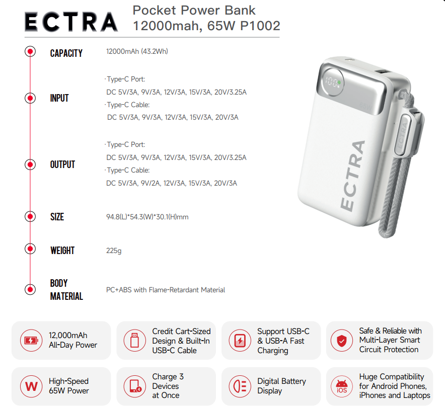 ECTRA Pocket Power Bank 12000mah, 65W P1002